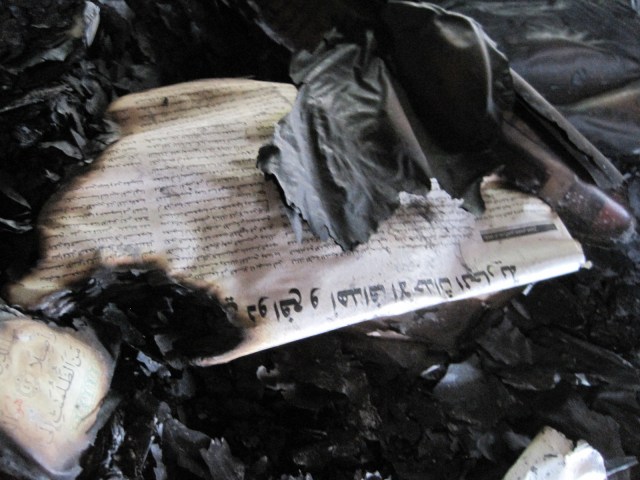 Det luktar brandrök i byn Yasuf och moskéns fönster står öppna för vädring. Därinne är mattorna delvis sönderbrända och taket svart av sot. Bokhyllan är tömd och på golvet ligger en hög av svarta flagor. Några blad har undkommit lågorna och är ännu läsbara. Det är sidor ur olika skrifter, en del av dem heliga – resterna av ett bokbål.